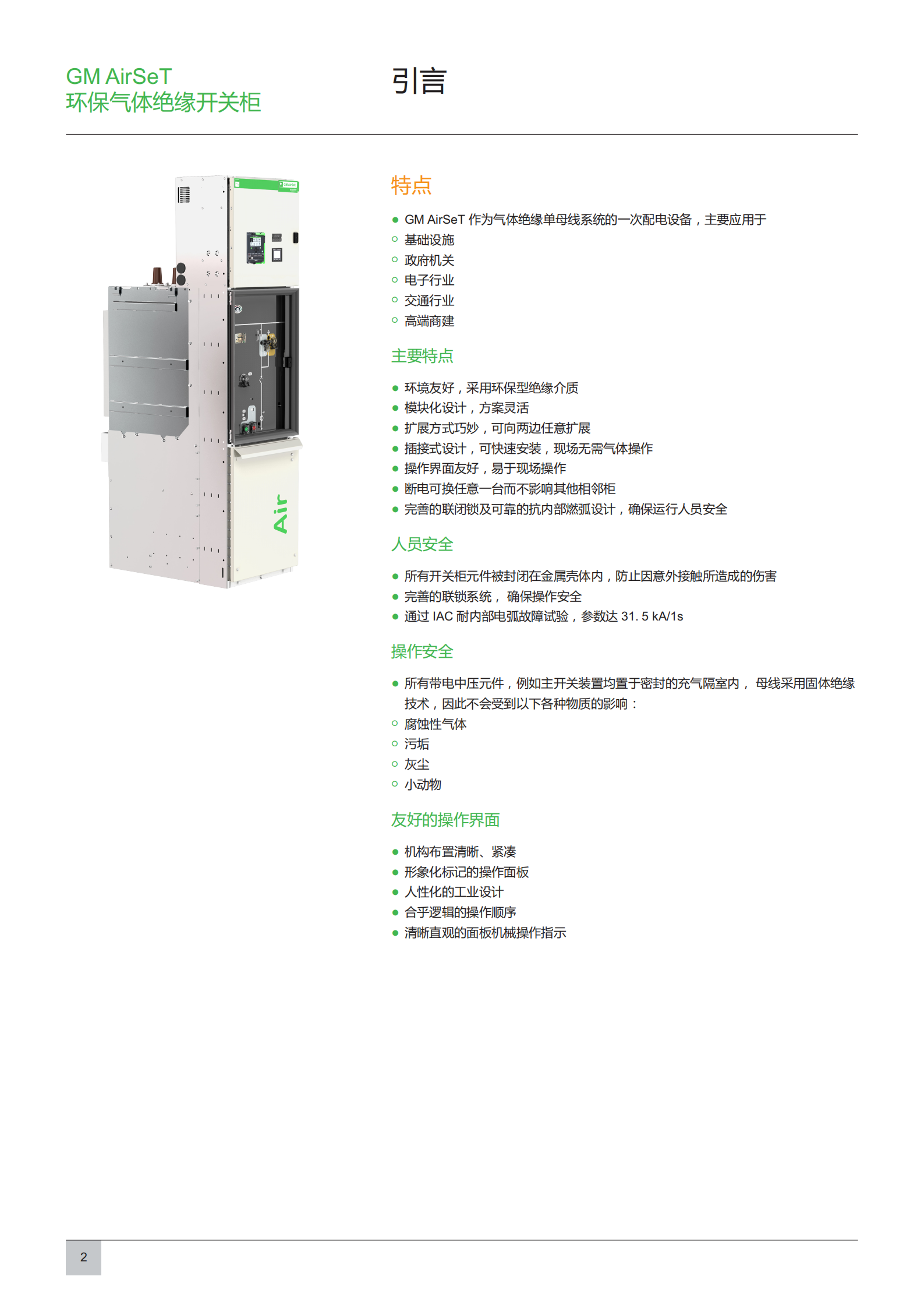 •模块化设计,方案灵活; •环境友好,采用环保型绝缘介质; •扩展方式巧妙,可向两边任意扩展; •插接式设计,可快速安装,现场无需气体操作; •操作界面友好,易于现场操作; •断电可换任意一台而不影响其他相邻柜; •完善的联闭锁及可靠的抗内部燃弧设计,确保运行人员安全